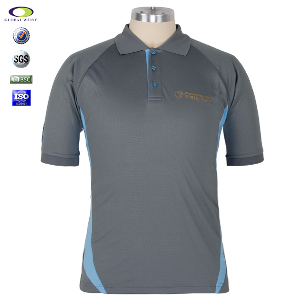 订制男士银灰蓝色拼接POLO衫翻领刺绣短袖T恤衫定制工厂 |