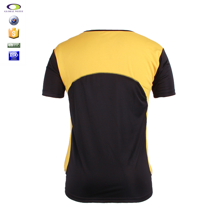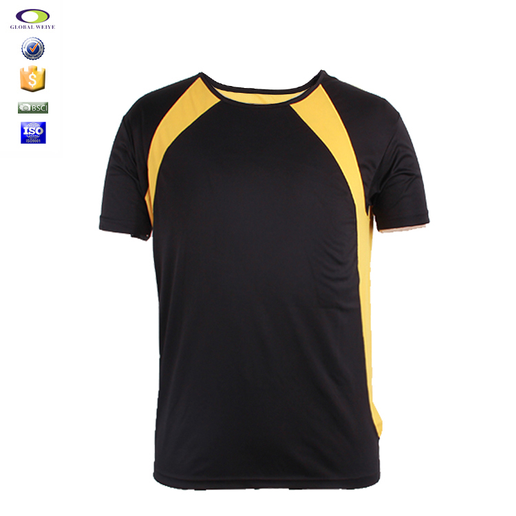 男士空白拼接插肩运动服圆领短袖T恤衫,采用全涤速干面料,舒适耐穿,高性价比,黄黑拼接撞色设计,突显时尚魅力,常适用于运动时尚休闲类场合 经典款式 短袖圆领 专业纸样 标准裁剪.