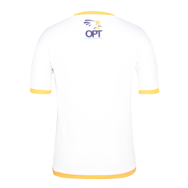 男士白色全涤异色领字母印花短袖T恤衫,采用全涤速干面料,舒适耐穿,高性价比, 白黄异色领撞色设计,前幅高品质环保丝网印logo 突显时尚魅力 专业纸样 标准裁剪,经典短袖时尚圆领款式。